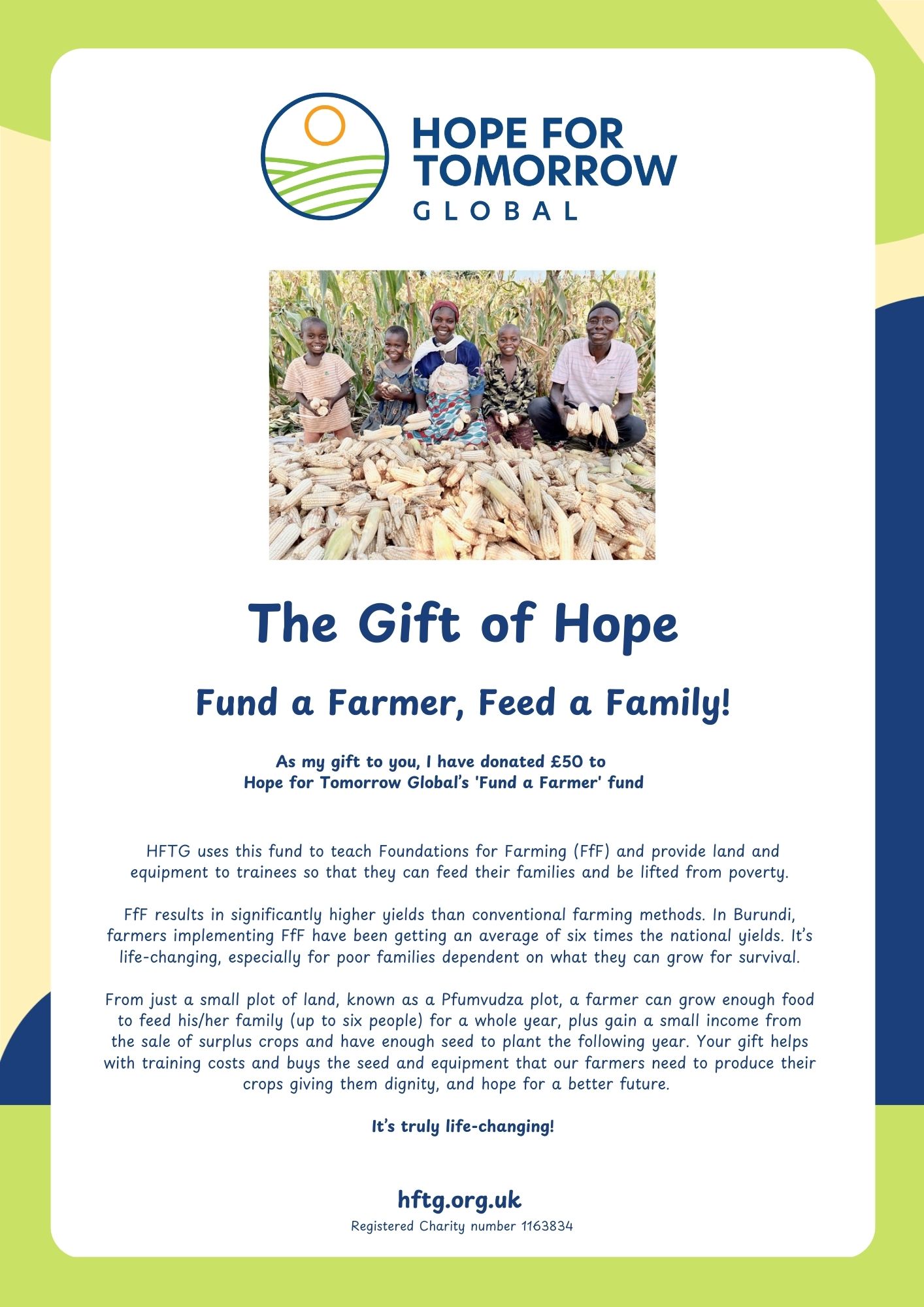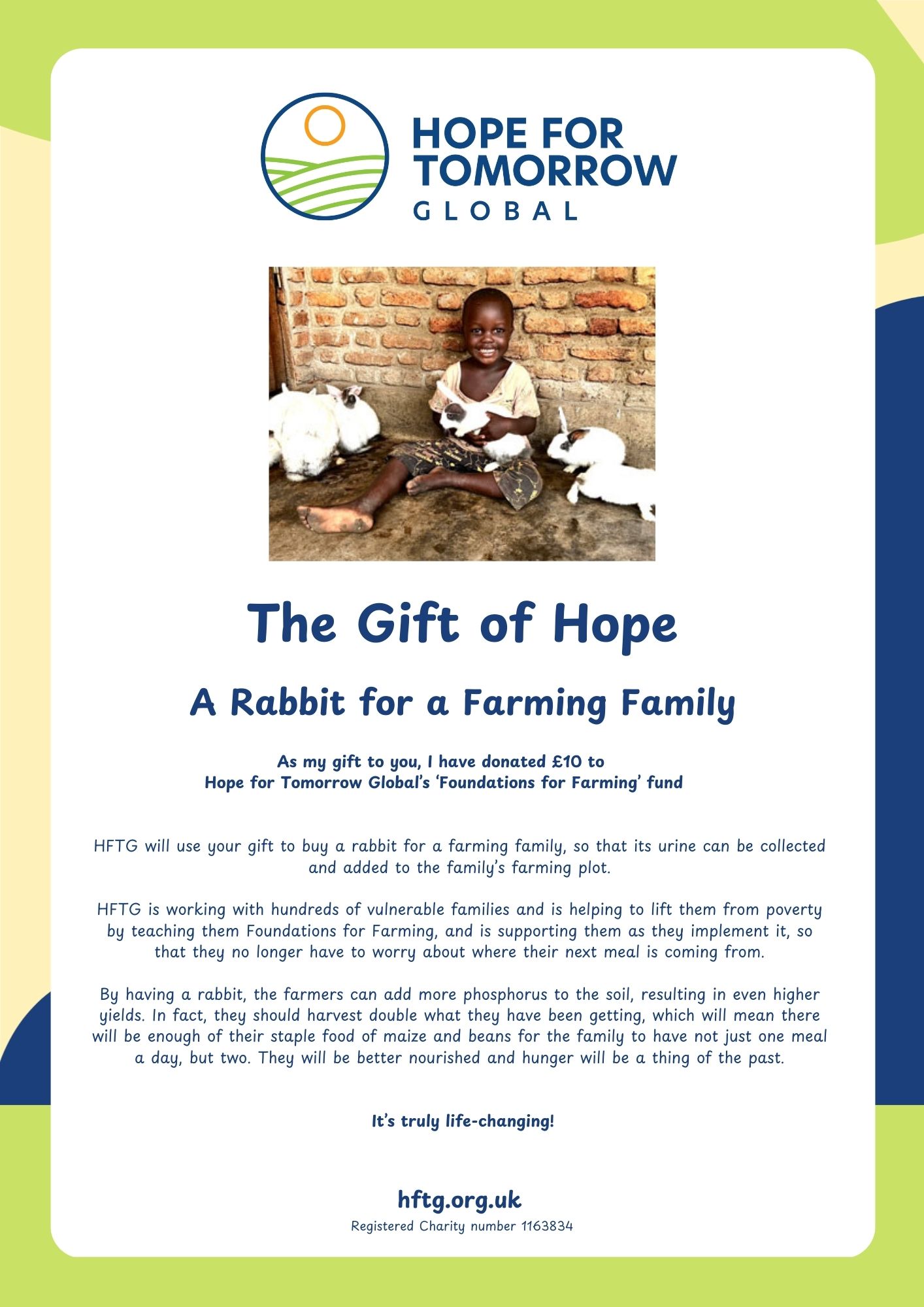 Gifts of Hope help vulnerable families in crisis with their basic needs for survival, including milk and porridge for malnourished children, as well as medical care. There’s also an opportunity to help children receive an education, giving them hope for their future and the gift to ‘Fund a Farmer’, offering a way out of poverty, assisting people learn how they can sustainably feed their families by implementing Foundations for Farming (FfF). Plus, new for Christmas 2025, the gift of a rabbit for a farming family, so that its urine can be collected and added to the family’s farming plot. This enriches the soil and can double the size of their harvest!