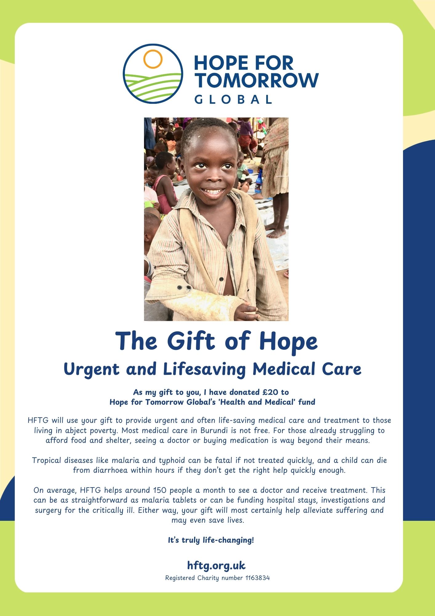 Your £20 gift will help alleviate suffering by providing urgent and often life-saving medical care and treatment to those living in abject poverty. In Burundi, most medical care must be paid for. Even seeing a doctor is beyond what the poor can afford, leaving them extremely vulnerable when they become ill. This gift really can help save lives.