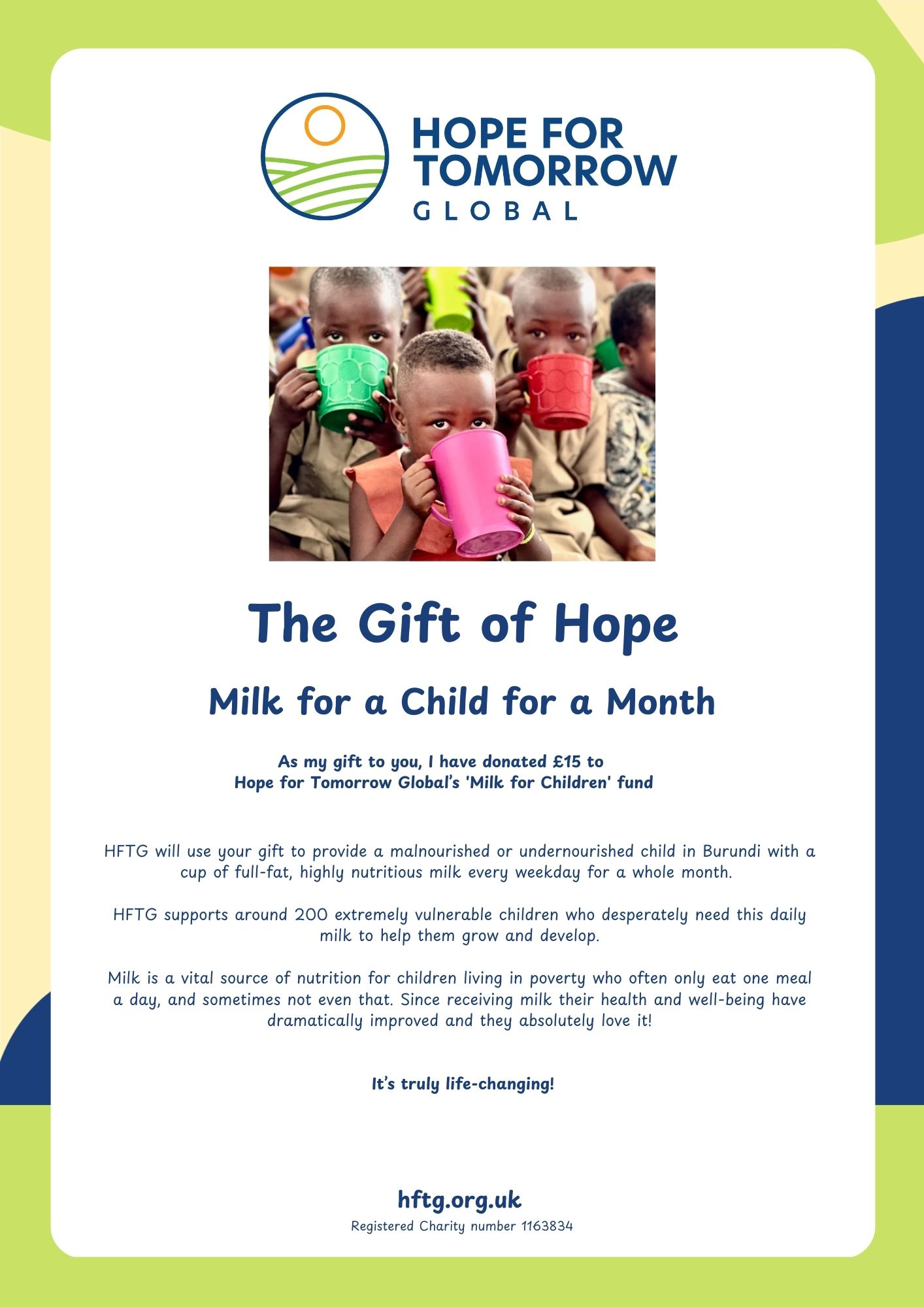 Your gift of £15 will provide a malnourished or undernourished child with a cup of full-fat, highly nutritious milk every weekday for a whole month.