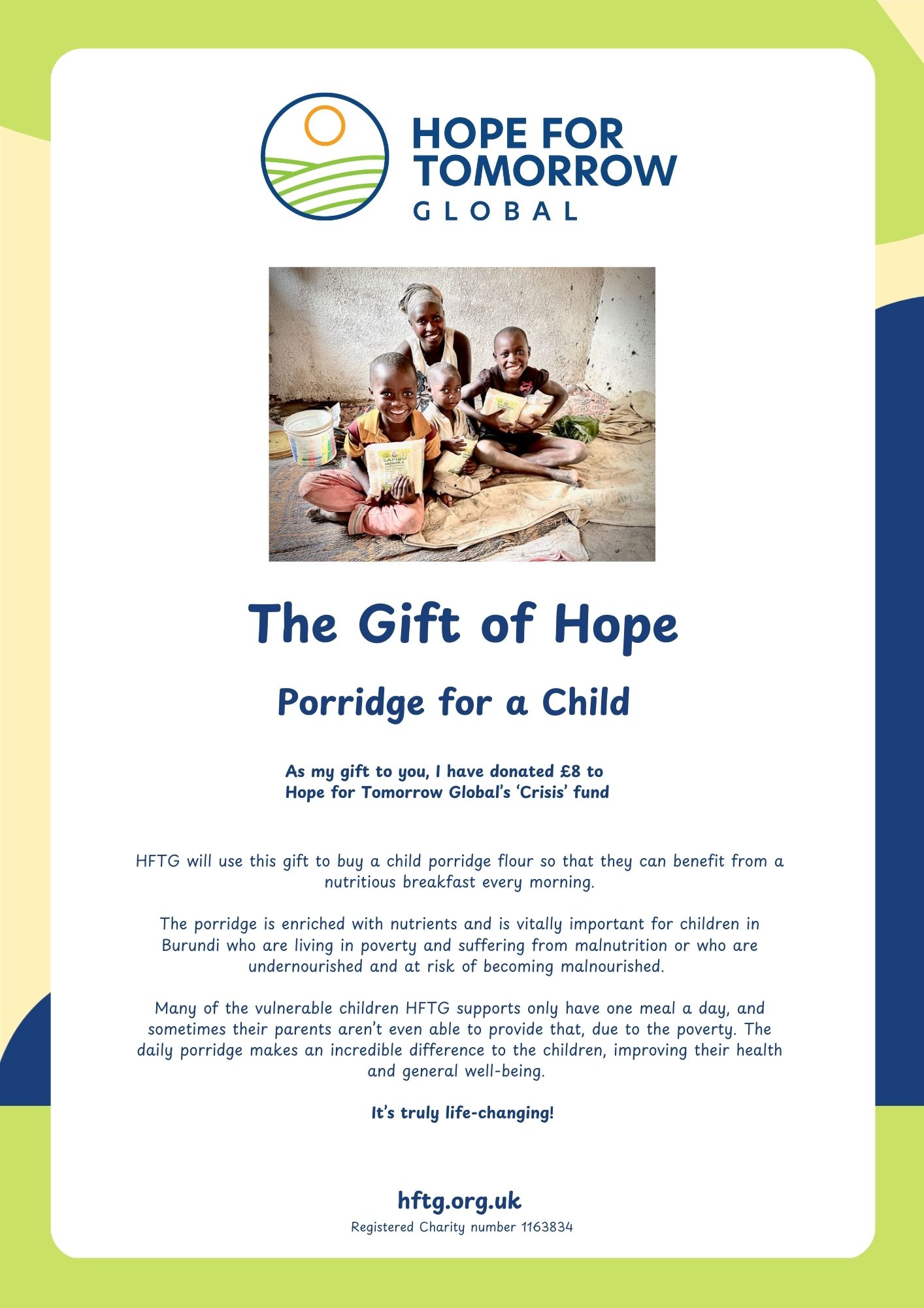 *Disclaimer: In the unlikely event that we have more porridge gifts purchased than are needed, your donation will go towards other crisis needs.